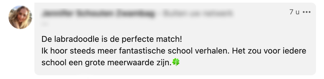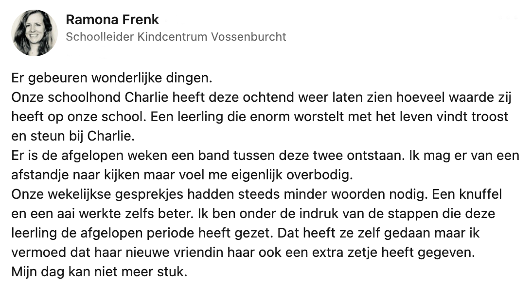 Sinds een aantal jaren is de schoolhond steeds populairder geworden. Een schoolhond dient als een soort ‘extra klasgenoot’. Leerlingen lijken minder stress te ervaren en worden ook lekker rustig van zo’n zachte viervoeter om zich heen. Ramona is schoolleider en op haar werk loopt inmiddels al één jaar een schoolhond rond. Op LinkedIn deelt ze een verhaal over hoe een van haar leerlingen enorme steun haalt uit schoolhond Charlie.