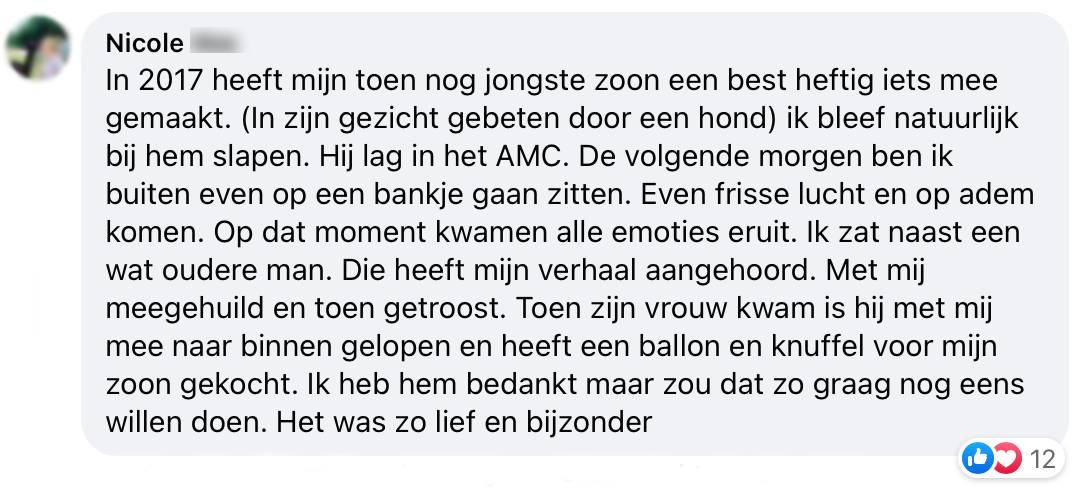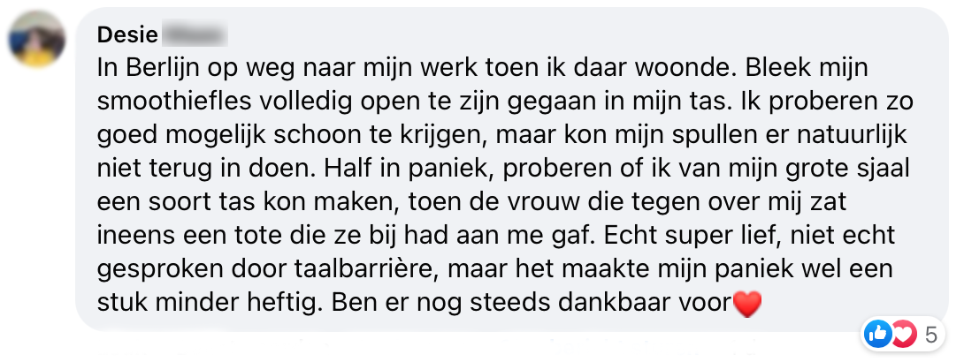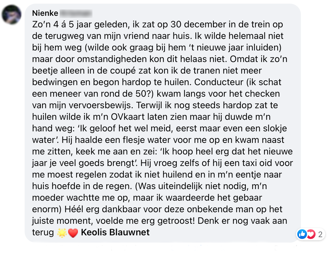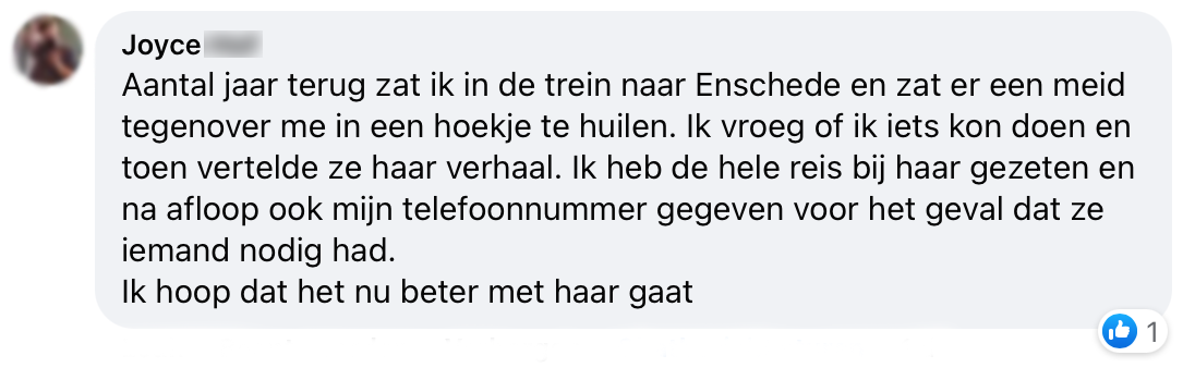 We hebben allemaal wel eens een moment waarop we onze tranen gewoon even niet kunnen bedwingen. Het is dan natuurlijk fijn als je even wat tijd voor jezelf kan pakken, of als je omringd bent door dierbaren. Toch is dit niet altijd het geval, en dan is het best fijn als iemand die je niet kent even laat merken dat die er voor je is. Soms kan een simpele blik of een flesje water al genoeg zijn. Laten we, zeker in deze tijd, wat vaker naar elkaar omkijken.