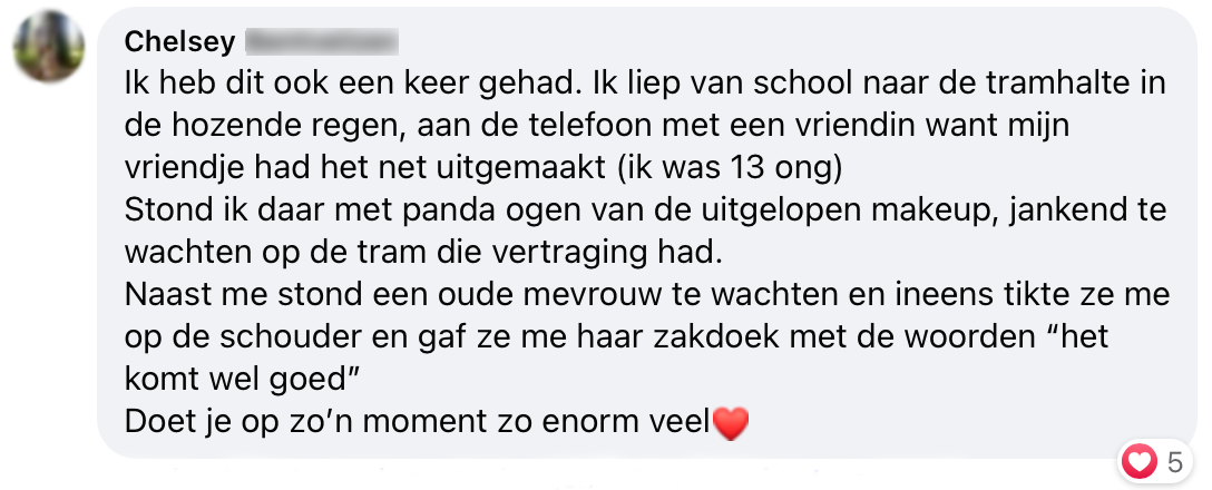 We hebben allemaal wel eens een moment waarop we onze tranen gewoon even niet kunnen bedwingen. Het is dan natuurlijk fijn als je even wat tijd voor jezelf kan pakken, of als je omringd bent door dierbaren. Toch is dit niet altijd het geval, en dan is het best fijn als iemand die je niet kent even laat merken dat die er voor je is. Soms kan een simpele blik of een flesje water al genoeg zijn. Laten we, zeker in deze tijd, wat vaker naar elkaar omkijken.