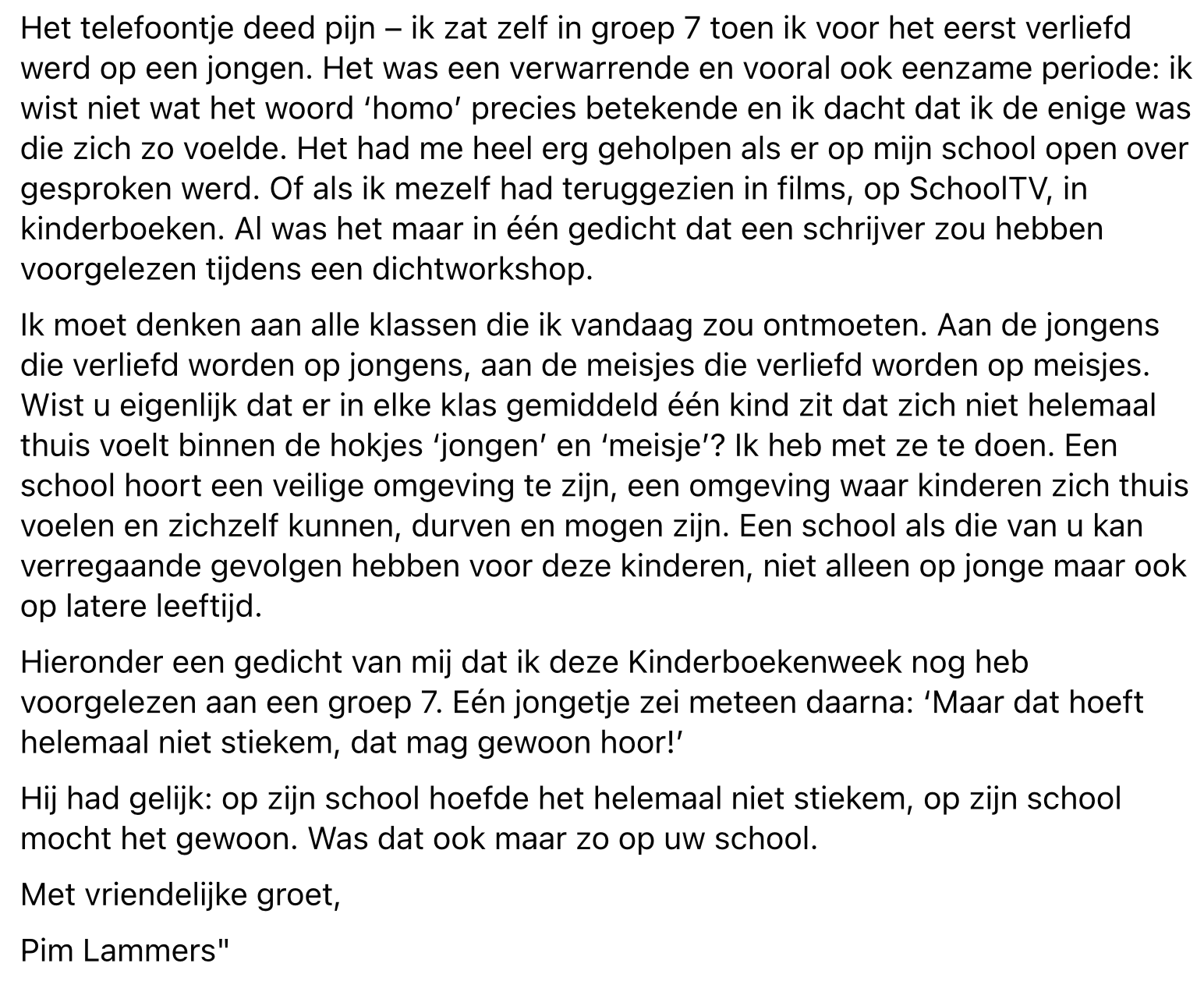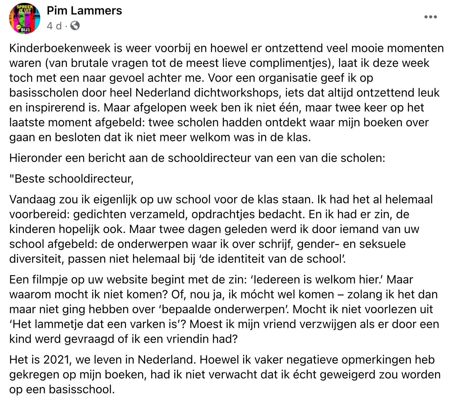 Schrijver Pim Lammers bracht in 2017 het eerste transgender prentenboek uit. Voor een organisatie mag hij tijdens de kinderboekenweek dichtworkshops geven door het hele land. Echter weigeren twee basisscholen hem vlak voor een les, omdat ze erachter kwamen ‘waar zijn boeken over gaan’. Ja, je leest het goed, zelfs in 2021 gebeuren er nog dit soort dingen. Iedereen moet kunnen zijn wie ze zijn en juist kinderen zouden dit zo vaak mogelijk moeten horen.