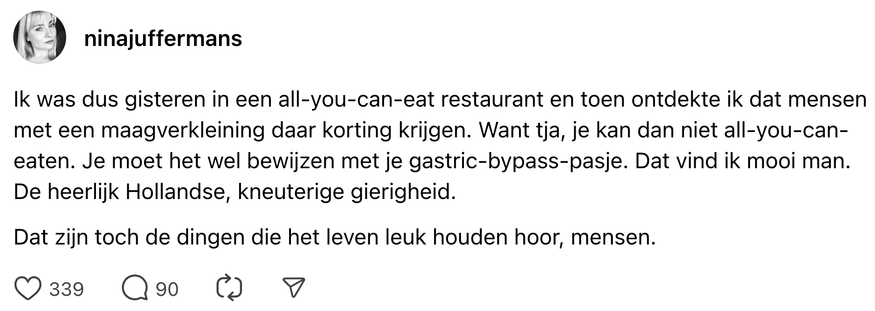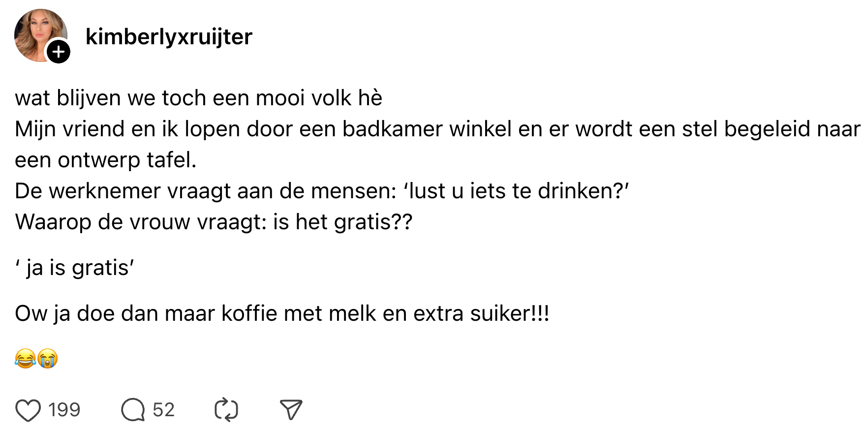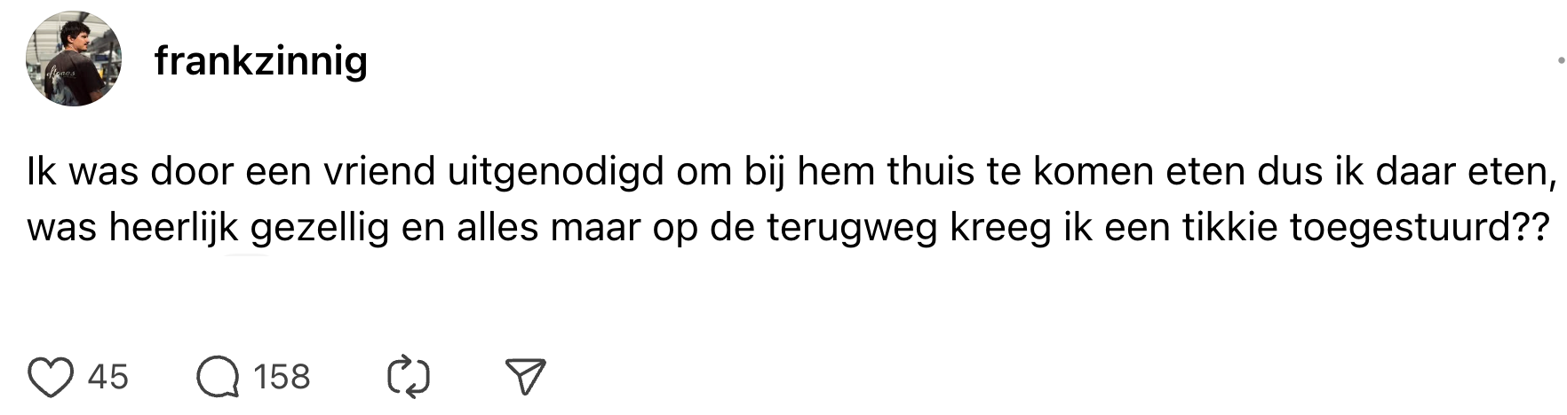 Nederlanders grijpen elke kans om een paar centen te besparen. Verwacht dus maar niet dat die havercappu bij een vriend thuis gratis is, en schrik vooral niet als je een schaamteloos betaalverzoek krijgt voor een verjaardagstraktatie op het werk. Déze acht Nederlanders delen de meest skere acties op social media, en die willen we je natuurlijk niet besparen. Vrijgevig, hè?