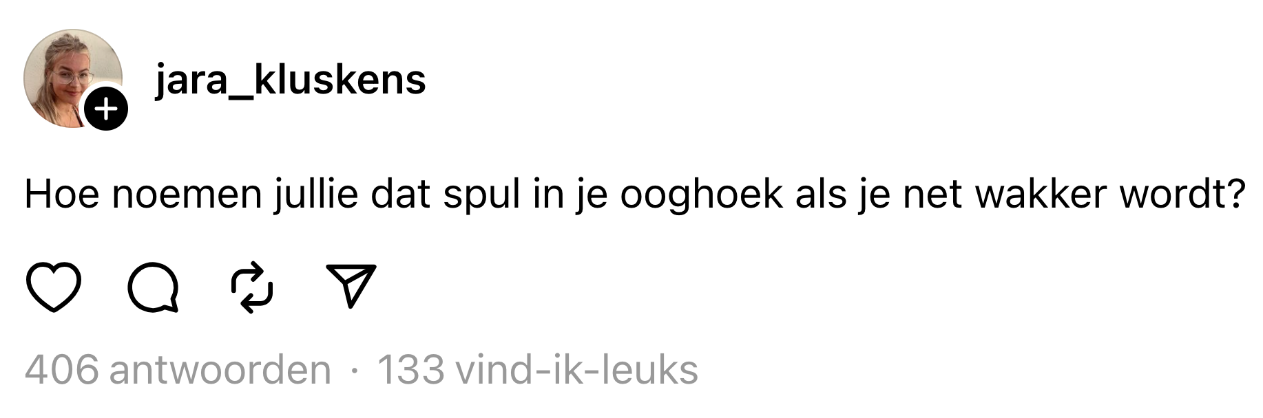 Het is helaas geen weekend meer, dus grote kans dat je vanochtend niet lang kon blijven liggen in je warme bed. Studie en werk wachten namelijk niet. Nog vervelender als je dan ook nog eens je ogen niet open krijgt door het spul dat in je ooghoek zit als je wakker wordt. Maar hoe heet dat spul eigenlijk? Jara kon er niet meer van slapen en stelde deze vraag daarom op Threads.