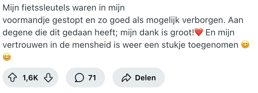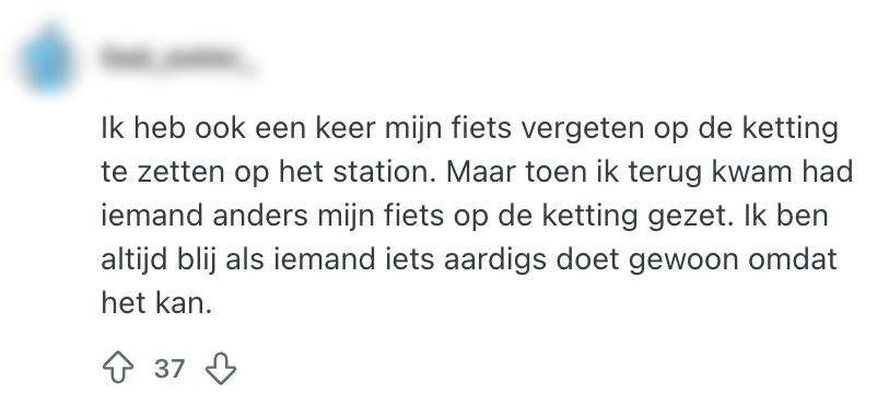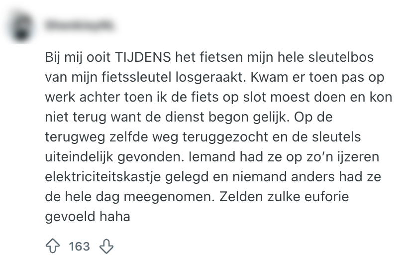 Afstappen, de standaard erop zetten, je tas onder de snelbinders vandaan halen en de fietssleutel uit het slot trekken: om je fiets een beetje degelijk te parkeren, moet je aardig wat stappen doorlopen. Als je haast hebt of met je gedachten heel ergens anders zit, kun je nog weleens een stap vergeten. Niet gek, wel vervelend. Een Reddit-gebruiker fietst naar het station, stapt rustig de trein in, en beseft pas op de terugweg dat-ie de sleutel niet uit diens fiets heeft gehaald. De fietser gaat uit van het ergste, maar treft bij de fietsenstalling het tegenovergestelde aan.