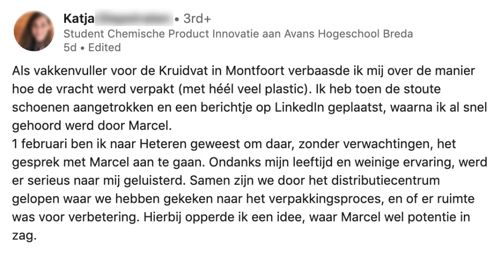 1. Ze schreef over haar plan op LinkedIn. Er werd heel veel plastic gebruikt door Kruidvat.