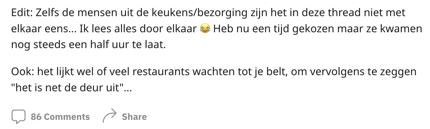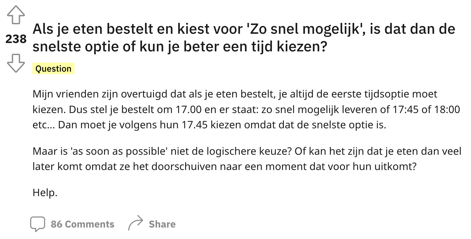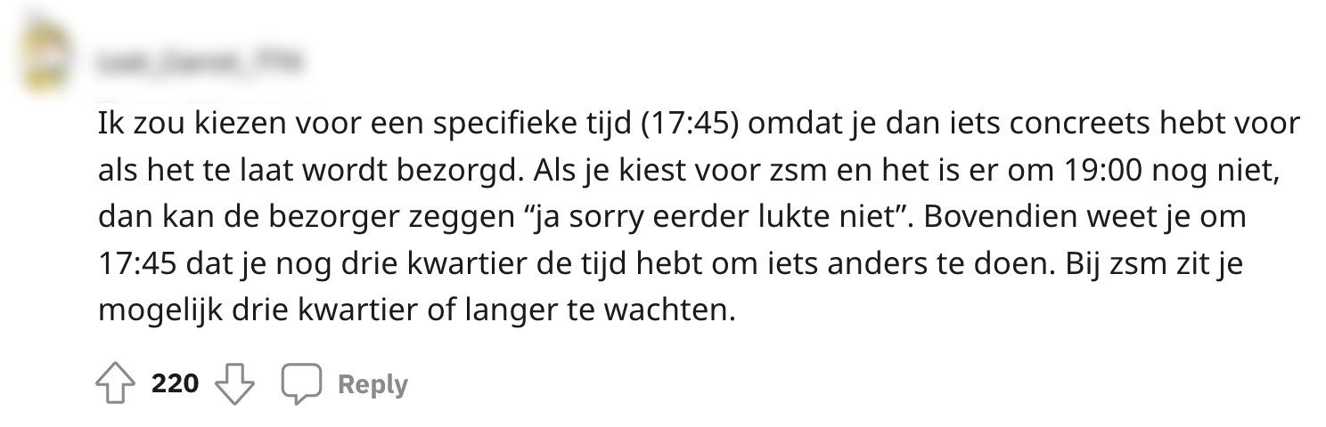 Wanneer je geen zin hebt om te koken, is de kans groot dat er binnen enkele minuten een bezorger op de stoep staat. Al die bezorgapps zijn best handig, maar het is soms lastig in te schatten hoe laat jij je eten kan verwachten. Je kan natuurlijk wel een gewenste bezorgtijd doorgeven, maar het lukt niet iedere restaurant om dit daadwerkelijk goed te timen. Een Nederlander vraagt zich af of je via Thuisbezorgd beter voor een specifiek tijdstip of voor de zo-snel-mogelijk-optie kan kiezen als je honger hebt. De meningen zijn nogal verdeeld en al snel wordt er op Reddit een flinke discussie bezorgd.