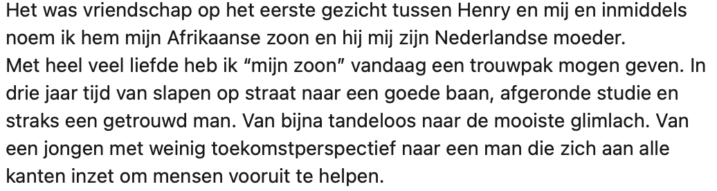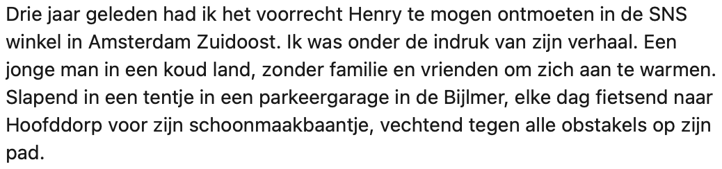 Soms kom je iemand tegen in je leven waar je vrijwel meteen een goede klik mee hebt. Jullie hebben bijvoorbeeld dezelfde droge humor of precies dezelfde stijl. Maar soms is er niet per se een reden voor de klik, maar is-ie er gewoon. Dat maakte Monique mee tijdens haar werk bij SNS, toen Henry als klant binnenkwam. Hij was net in Nederland en leefde op straat, maar een paar jaar later is zijn leven drastisch veranderd…