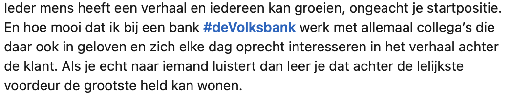 4. De bankmedewerker ontvangt veel lof voor haar verhaal.