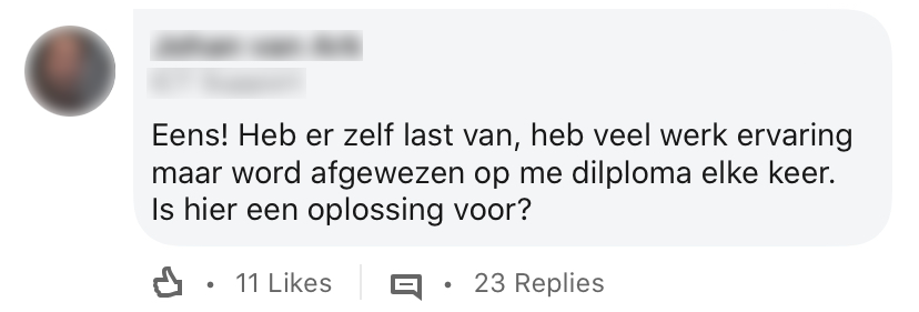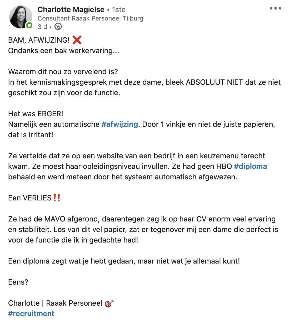 Een goede baan zoeken is, zeker in deze tijd, allesbehalve makkelijk. Er wordt enorm veel gesolliciteerd, waardoor er helaas ook vaak afwijzingen plaatsvinden. Heeft een sollicitant niet het benodigde diploma, dan belandt de sollicitatie vaak rechtstreeks in de prullenbak, terwijl deze persoon juist heel geschikt zou kunnen zijn. Charlotte Magielse van uitzendbureau Raaak Personeel wil meer aandacht voor dit onderwerp en deelde dit bericht op LinkedIn.