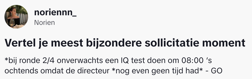 Als je wordt uitgenodigd voor een sollicitatiegesprek, laat je waarschijnlijk niet direct het achterste van je tong zien. Je wilt immers een goede eerste indruk maken en niets verkeerds zeggen. Sommige recruiters en medewerkers hebben daar (helaas) wat minder last van en vuren de meest rare vragen en opmerkingen op sollicitanten af. Wanneer Norien via TikTok vraagt naar de meest vreemde momenten tijdens het solliciteren, krijgt ze verhalen binnen die alleen maar meer vragen oproepen.
