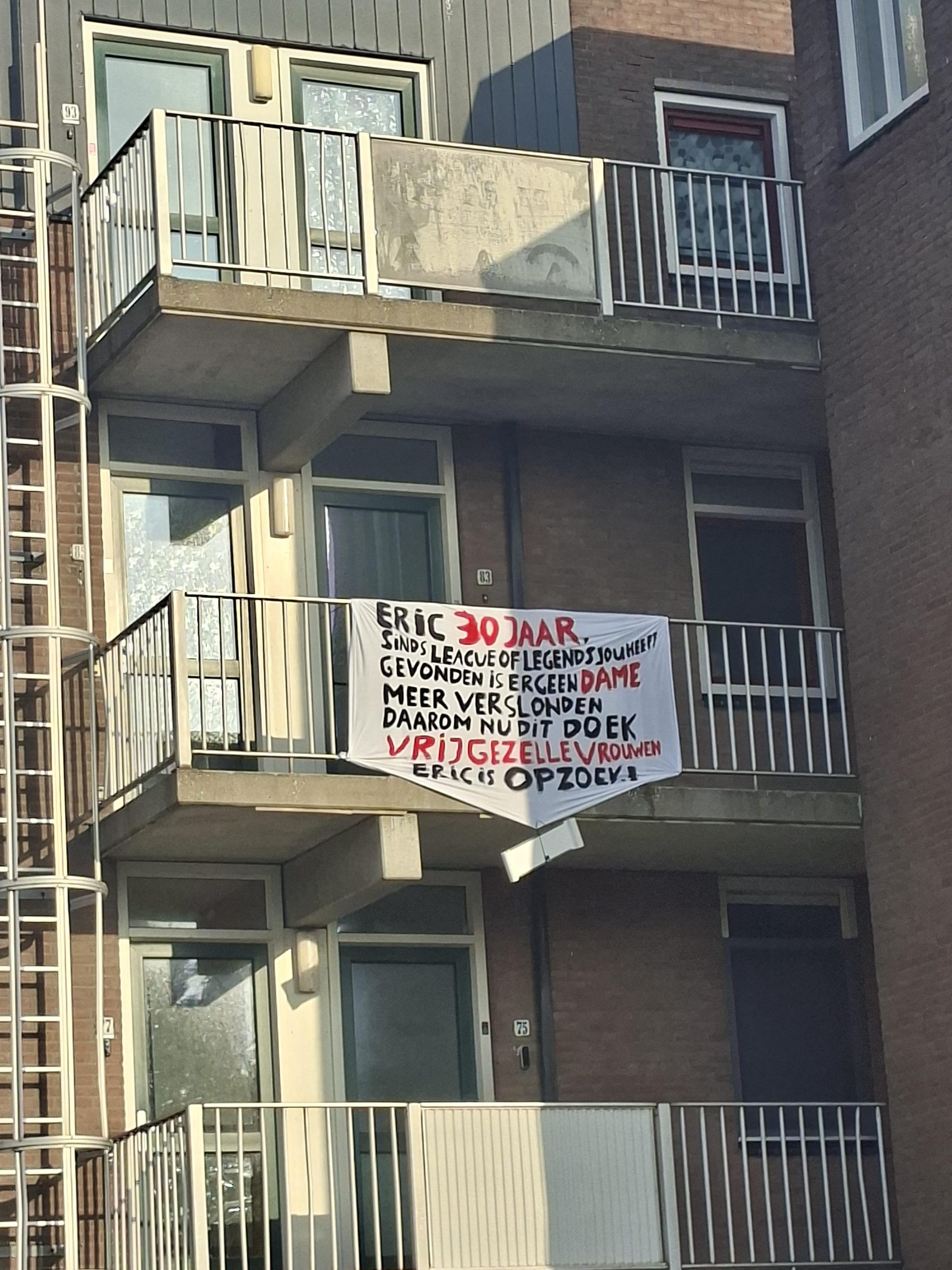 Daten anno 2025 is een beetje als een slechte nieuwjaarsviering. Je hoopt op vuurwerk en een knallend begin, maar je eindigt met een rotje dat niet de lucht in gaat en een kater. Eric is al een tijd lang single en zijn omgeving vindt dat het tijd is voor verandering. Om hem een handje te helpen, hangen zij een spandoek met een opvallende boodschap aan zijn balkon.
