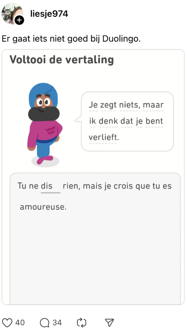 Duolingo-gebruikers niet bepaald verliefd op flinke spelfout in Nederlandse zin