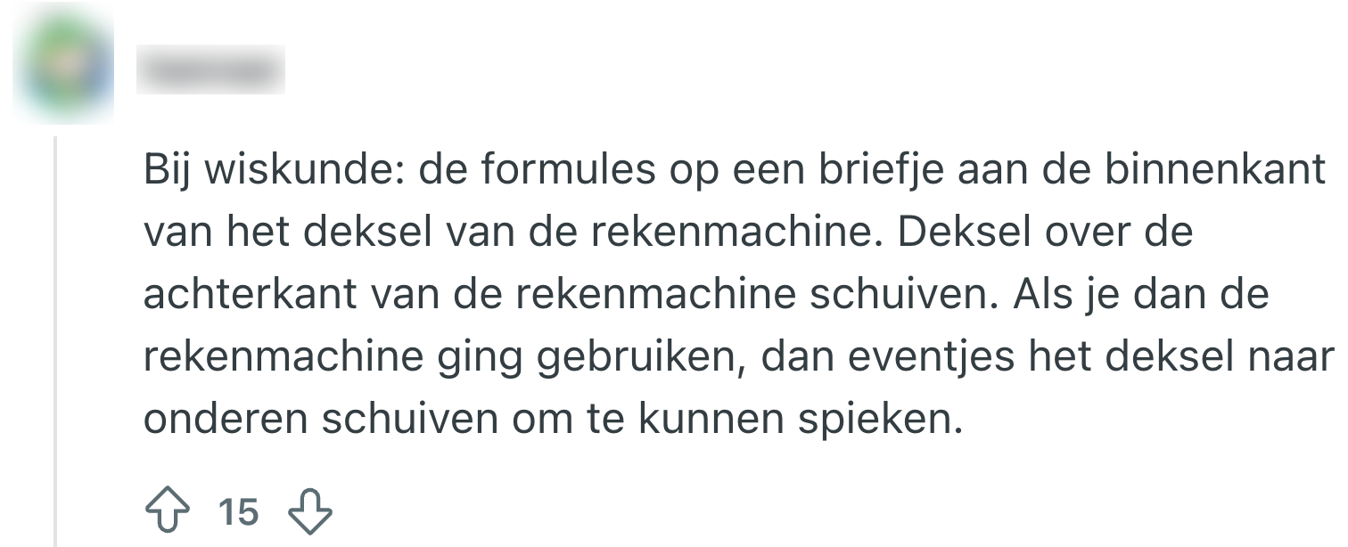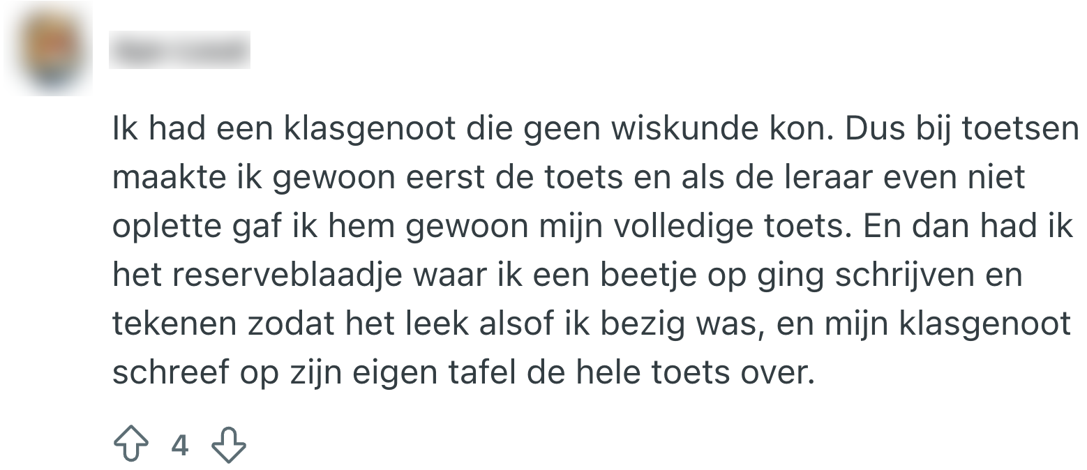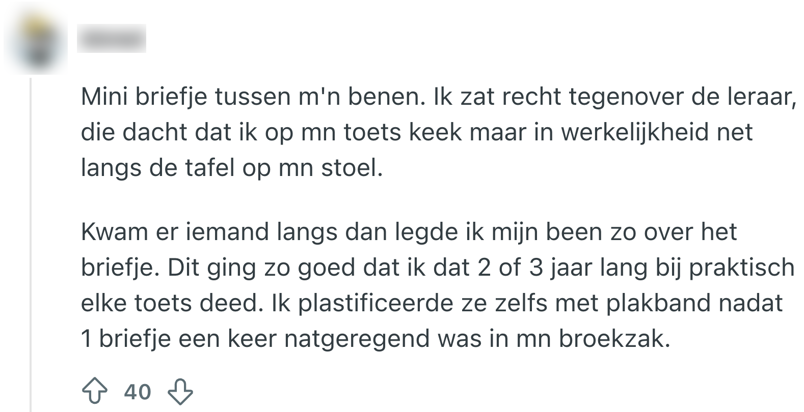 Als middelbare scholier wist je heus wel dat dat ene belangrijke proefwerk eraan kwam, maar was het veel verleidelijker om de hele middag gamen of met je vrienden af te spreken. Je had dan ook écht geen tijd om te leren. En daardoor zat er tijdens de toets slechts één ding op: spieken. Op Reddit vraagt iemand naar de manieren waarop er vroeger werd afgekeken, en één ding is zeker: als afkijken een toets zou zijn, zouden deze Nederlanders daar met vlag en wimpel voor slagen.
