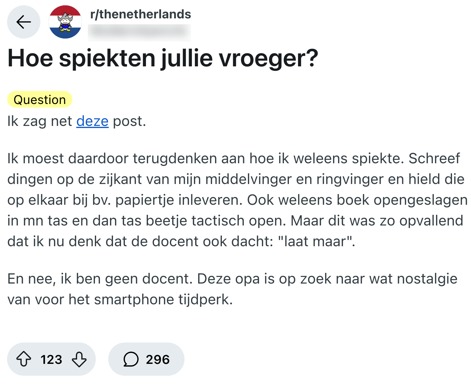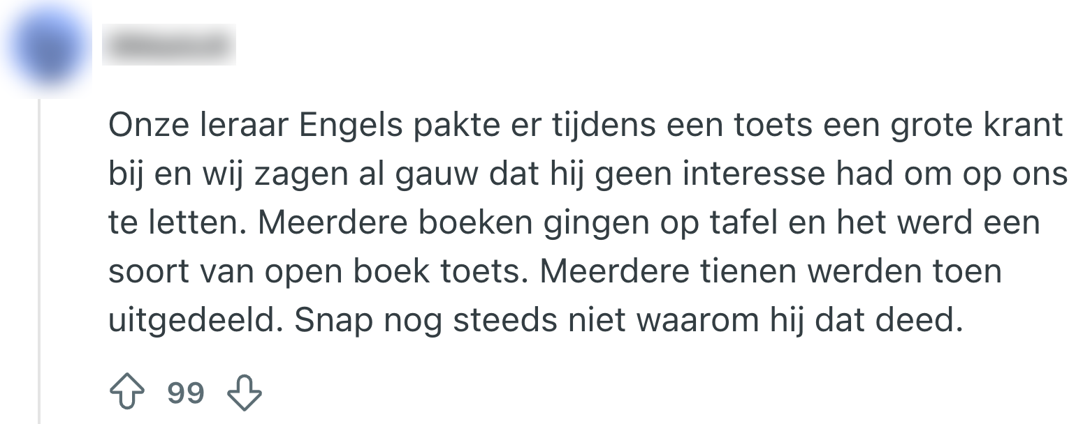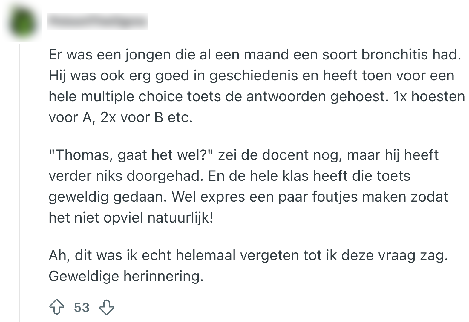 Als middelbare scholier wist je heus wel dat dat ene belangrijke proefwerk eraan kwam, maar was het veel verleidelijker om de hele middag gamen of met je vrienden af te spreken. Je had dan ook écht geen tijd om te leren. En daardoor zat er tijdens de toets slechts één ding op: spieken. Op Reddit vraagt iemand naar de manieren waarop er vroeger werd afgekeken, en één ding is zeker: als afkijken een toets zou zijn, zouden deze Nederlanders daar met vlag en wimpel voor slagen.