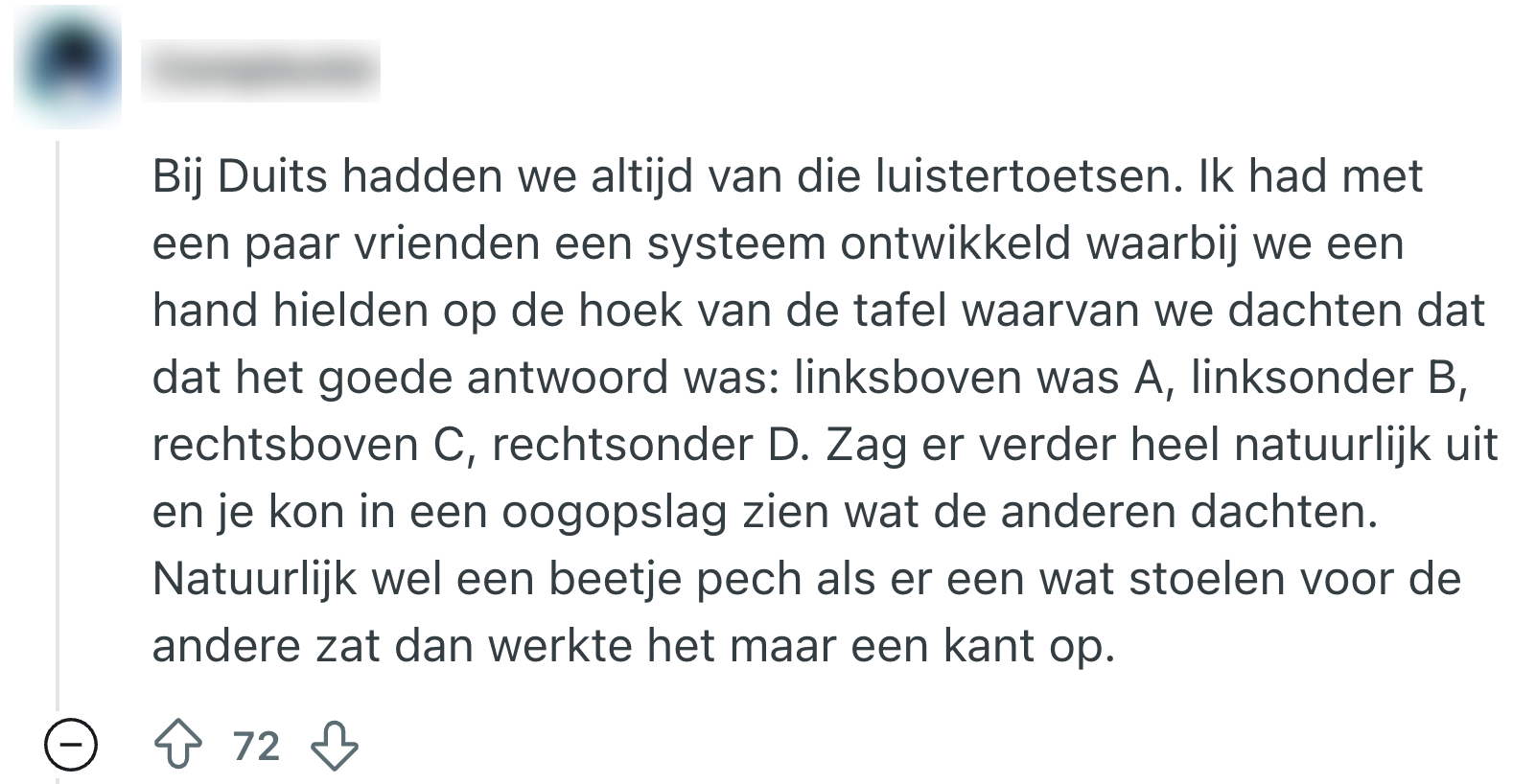 Als middelbare scholier wist je heus wel dat dat ene belangrijke proefwerk eraan kwam, maar was het veel verleidelijker om de hele middag gamen of met je vrienden af te spreken. Je had dan ook écht geen tijd om te leren. En daardoor zat er tijdens de toets slechts één ding op: spieken. Op Reddit vraagt iemand naar de manieren waarop er vroeger werd afgekeken, en één ding is zeker: als afkijken een toets zou zijn, zouden deze Nederlanders daar met vlag en wimpel voor slagen.