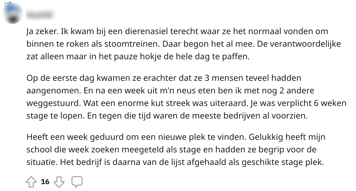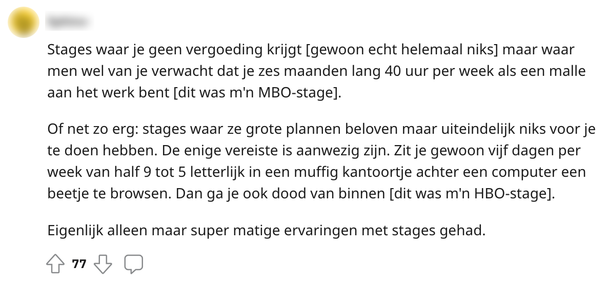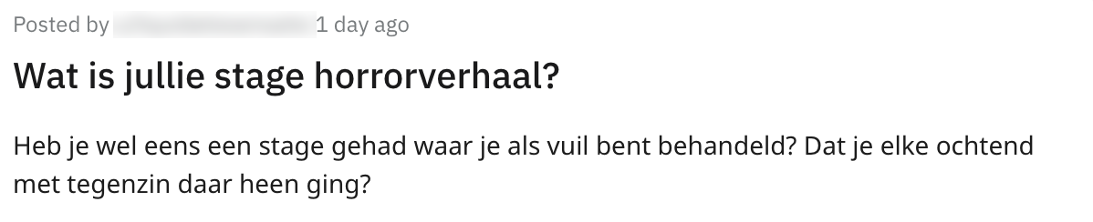 Of je nu op het mbo of het hbo zit, we moeten er allemaal een keer aan geloven: stage lopen. En dat stagiaires bij het ene bedrijf beter behandeld worden dan bij het andere bedrijf is bij iedereen bekend. Met dit feit in het achterhoofd, was deze Reddit-gebruiker toch benieuwd naar de krochten van de stagewereld in Nederland.