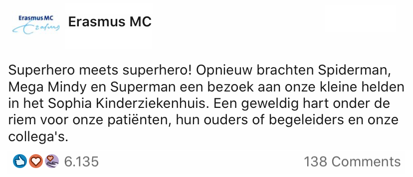 In deze tijd is een bezoekje brengen erg lastig. Voor de patiënten in het ziekenhuis is het ook enorm moeilijk: ze mogen namelijk een beperkt aantal mensen op bezoek hebben. Voor de ‘kleine helden’ in het Sophia Kinderziekenhuis, onderdeel van het Erasmus MC, stond er kort geleden iets bijzonders op het programma. Het ziekenhuis regelde namelijk dat een aantal superhelden langs zou komen en dat gebeurde op een wel heel bijzondere manier.