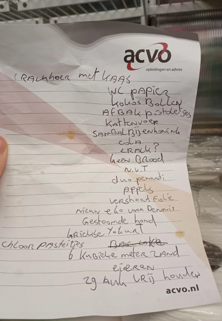 In de supermarkt kom je van alles tegen. Van mensen die eindeloos twijfelen bij het schap, tot vergeten briefjes die ergens tussen de producten opduiken. Meestal kijk je er niet raar van op, maar soms ligt er iets dat toch net effe je aandacht trekt. Dat gebeurde ook bij deze klant, die een achtergelaten boodschappenlijstje vond met wel heel opvallende benodigdheden. Geen standaard melk-en-broodcombinatie, maar een lijst met items die hopelijk niet allemaal verkrijgbaar zijn in een supermarkt…