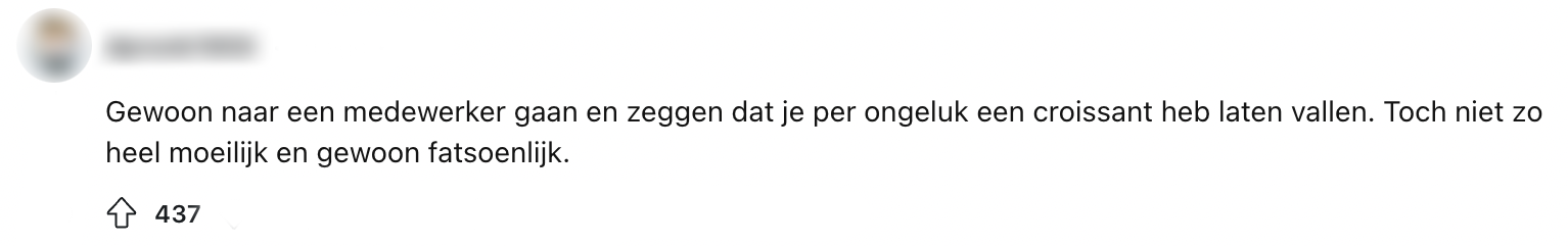 Stel: je bent in de supermarkt en je probeert op een onhandige manier met je telefoon in je ene hand en het plastic zakje in de andere met die irritante tang een droog croissantje in het zakje te gooien. Je bent er bijna, maar op het laatste moment laat je hem toch net voor je voeten vallen. Na even flink in jezelf te vloeken en heel hard te zuchten moet je snel handelen. Ga je het croissantje oppakken en neem je het mee? Pleur je het terug in de bak? Of loop je nonchalant weg alsof je niks te maken hebt met dat ding op de grond?