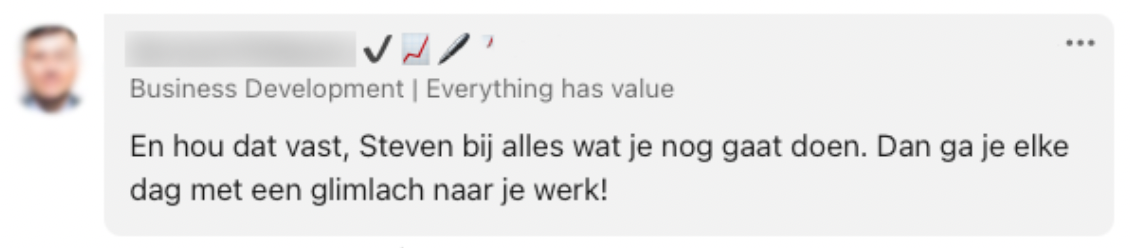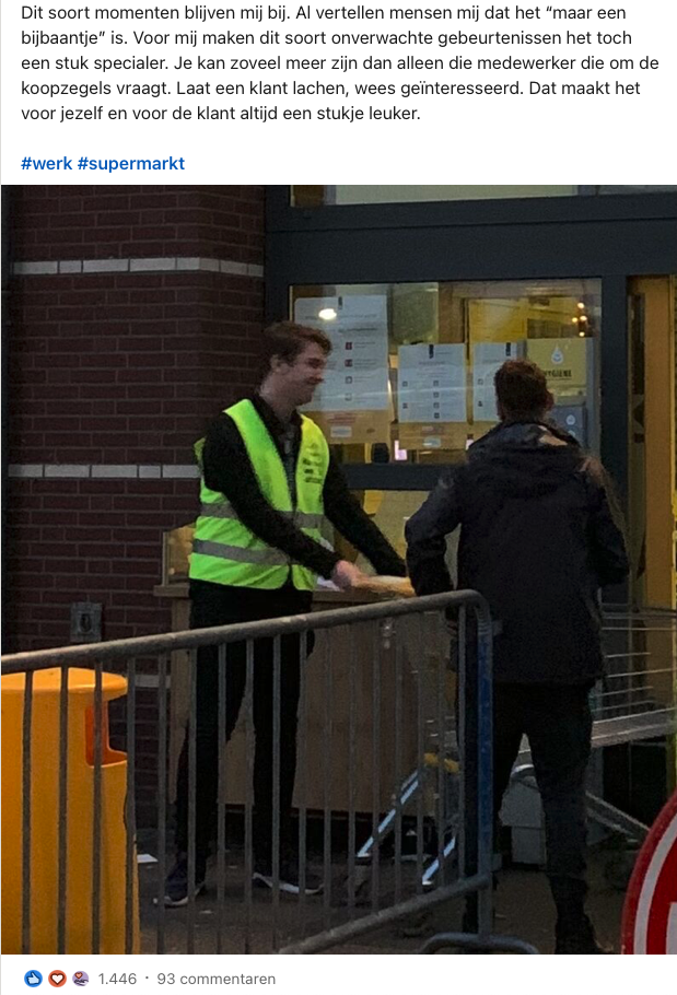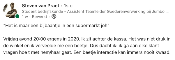 Steven van Praet deelt op zijn LinkedIn dat hij het belangrijk vindt om persoonlijk contact te maken met klanten. Als hij op een dag in 2020 een keer wat minder te doen heeft besluit hij aan elke klant te vragen hoe het met diegene gaat. Soms krijgt hij een standaard antwoord, maar soms mondt het uit in bijzondere gesprekken. Het werken in een supermarkt kan zoveel meer zijn dan ‘alleen maar een bijbaantje’.