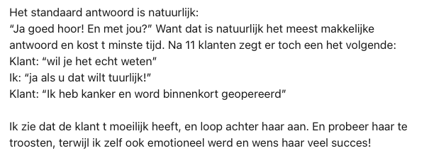 2. Soms krijgt hij een standaard ‘Prima, en met jou?’, maar soms vertellen mensen ook hoe het écht met hun gaat.
