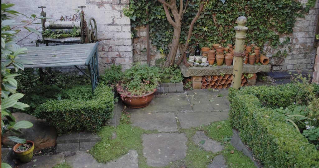 Bewoners verwijderen bladeren uit tuin buurvrou...