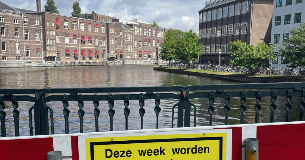 Voorbijganger spot onbegrijpelijk bord bij brug en l...