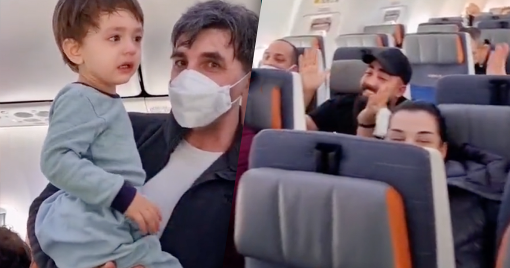 Medepassagiers helpen ouders van huilende baby in vl...