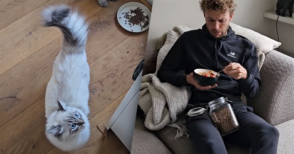 Katten krijgen vreemde maaltijd nadat baasje ee...