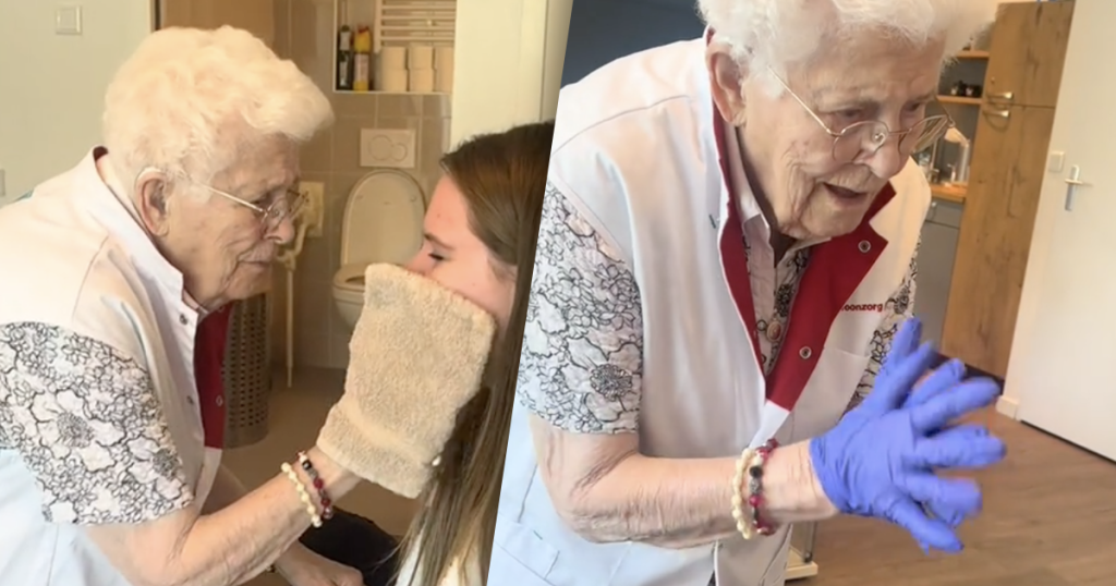 Oudere vrouw verzorgt personeel van verpleeghuis en ...
