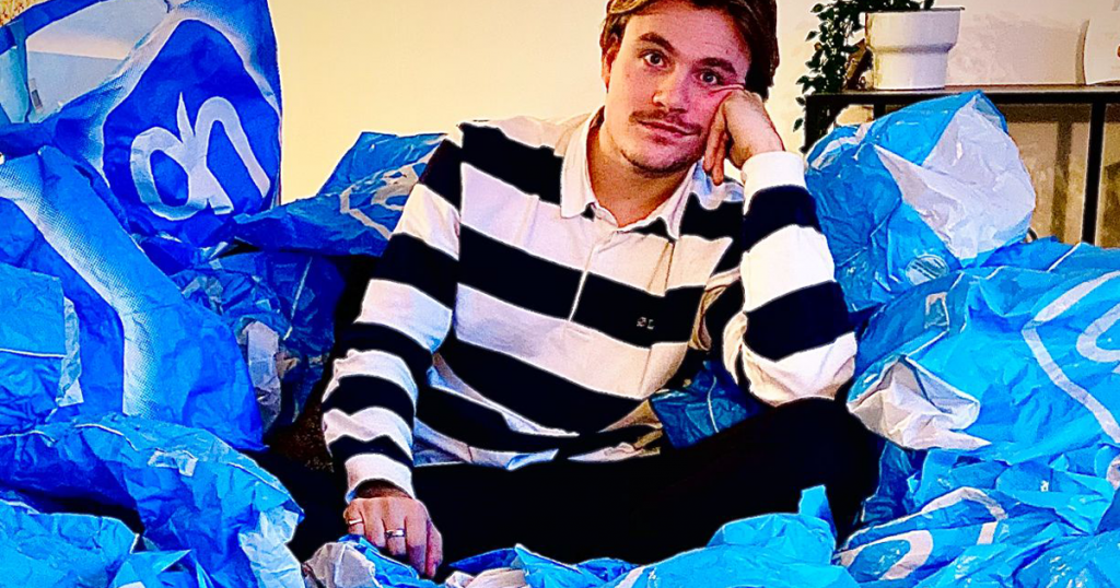 Jasper is gefascineerd door de plastic tas met plast...