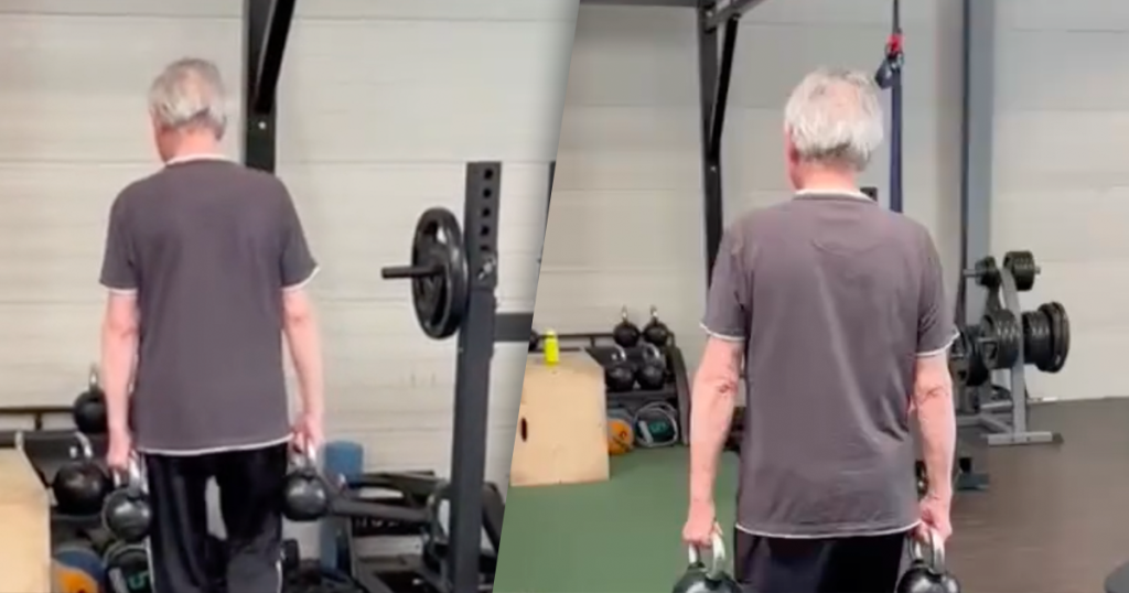Oudere man neemt personal training om wel heel bijzo...