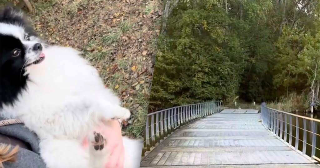 Vrouw loopt door bos en wordt gevolgd door opdringer...