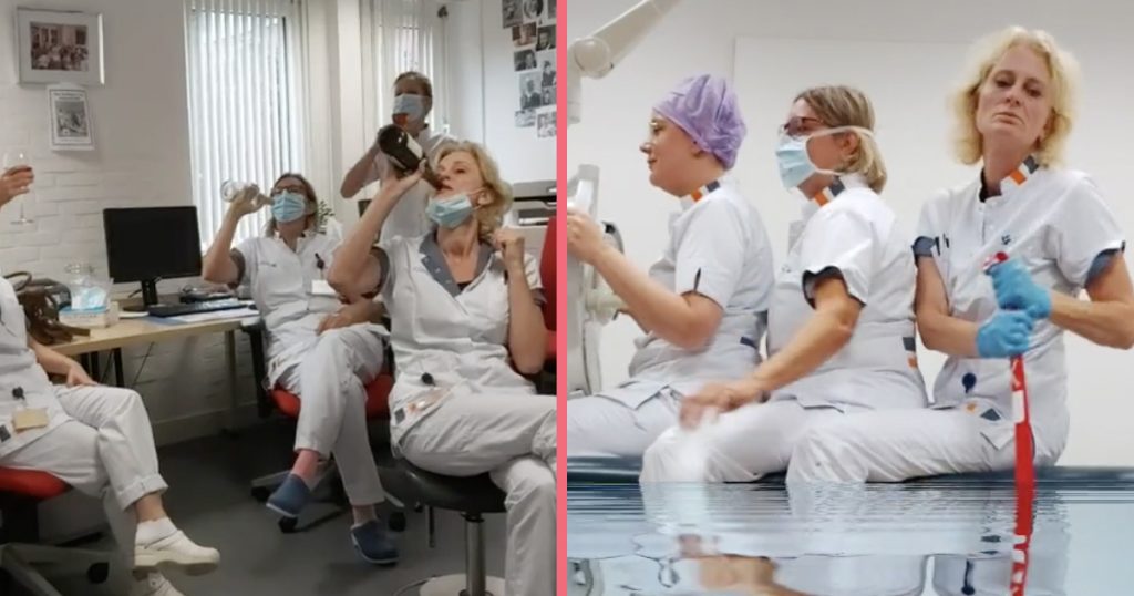 Oudere vrouw verzorgt personeel van verpleeghuis en ...