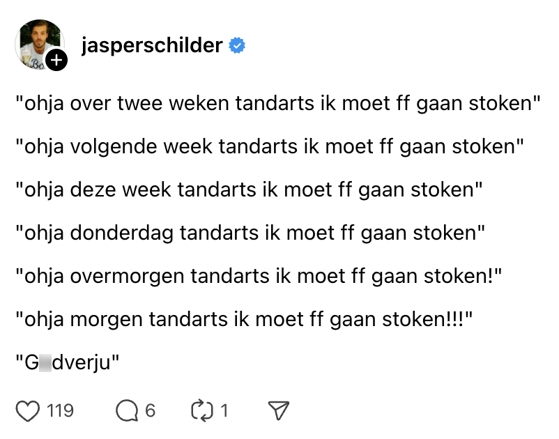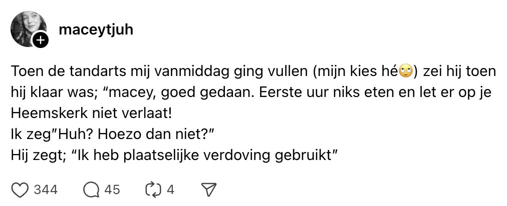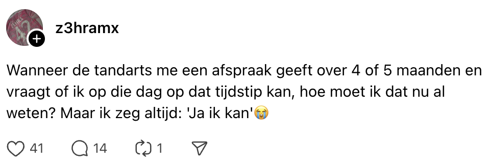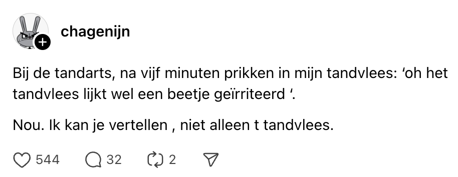 Eerlijk is eerlijk: niemand gaat voor de lol naar de tandarts. Je zit (voor je gevoel) urenlang in de wachtruimte terwijl je omringd wordt door gillende kinderen. Vervolgens krijg je allerlei gereedschap in de mond geduwd, en zodra je eindelijk de behandelkamer mag verlaten, moet je nog een nieuwe afspraak maken bij een passief agressieve receptionist. En een (half)jaar later begint het riedeltje weer opnieuw. Moet jij binnenkort weer geloven aan een tandartsbezoek? Dan hopen we het leed met deze tien posts een beetje te verzachten. Misschien kun je erom lachen, en dan bedoelen we niet als een boer met kiespijn.