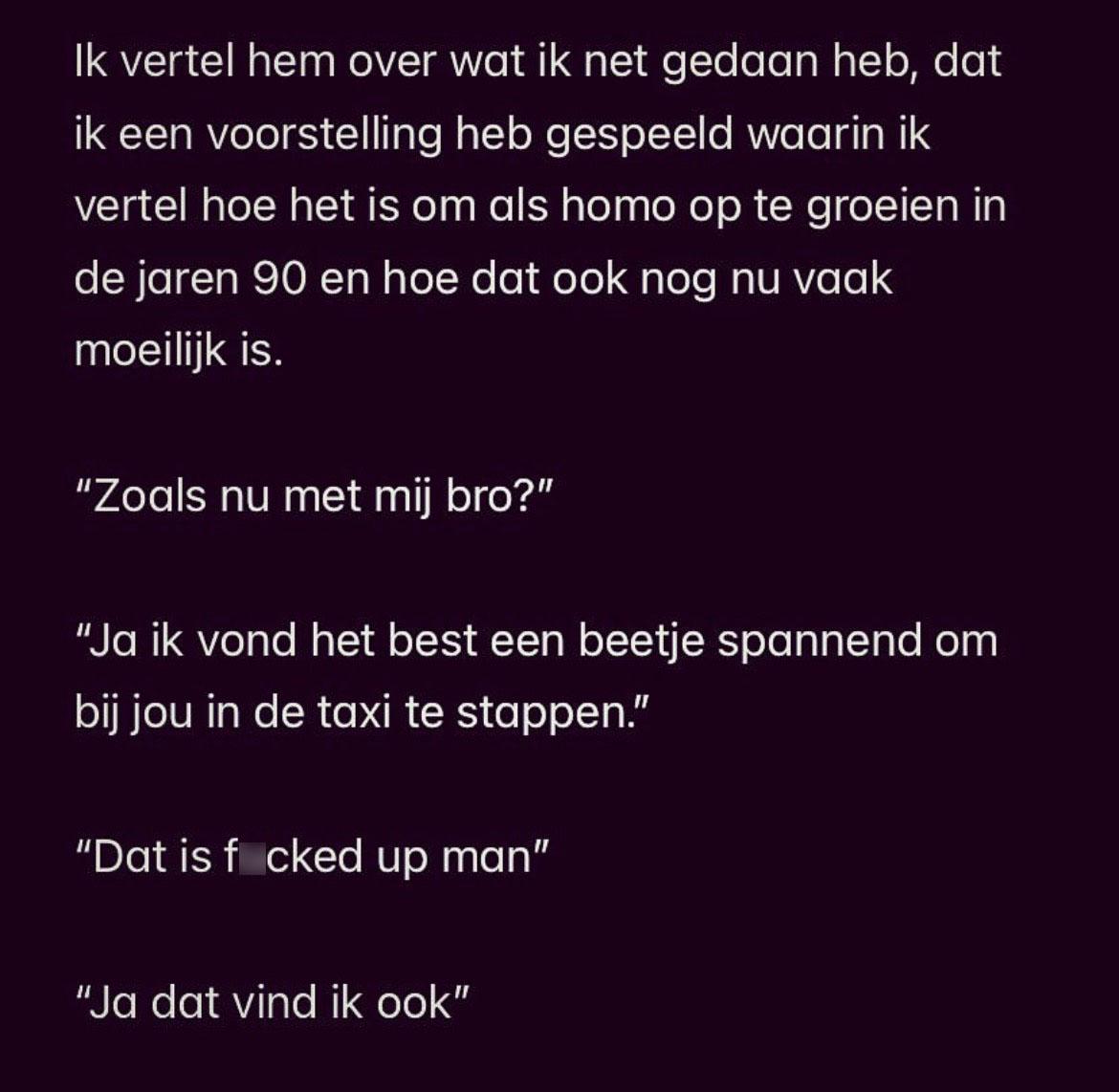 De beste gesprekken vinden vaak plaats wanneer je ze niet verwacht. In het openbaar vervoer, bijvoorbeeld. Nadat artiest Bertram een voorstelling heeft gegeven over de impact van woorden en homofobie, gaat hij noodgedwongen met een taxi naar huis. Daar raakt hij aan de praat met de taxichauffeur. De twee voeren een bijzonder gesprek, dat zowel Bertram als veel andere mensen raakt.