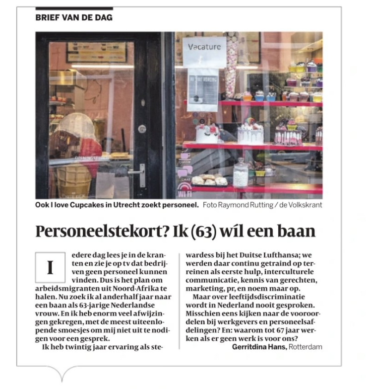 Krankzinnig veel reacties op mijn verslaggeverscolumn over Gerritdina en leeftijdsdiscriminatie. De teller staat nu op 9 aanbiedingen aan haar met echt interessante banen. Sommige directeuren reageren in eigen persoon: ‘Wij zijn juist op zoek naar rijpere mensen met ervaring’. >