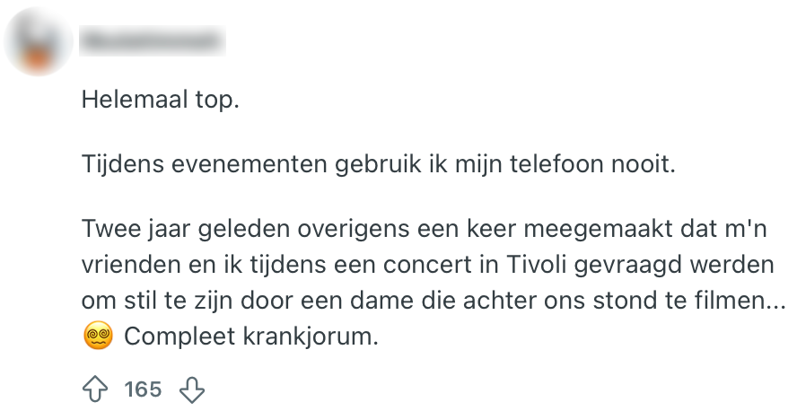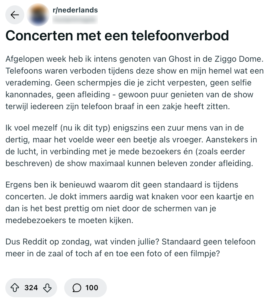 Net als in het dagelijks leven, is een telefoon op festivals en tijdens concerten voor veel mensen onmisbaar. Je moet je vrienden via WhatsApp laten weten waar je bent (spoiler alert: in een gore DIXI) en je wil je favoriete artiest in volle glorie vastleggen. Juist omdat zoveel momenten worden gefilmd en gedeeld, laten veel evenementenlocaties en artiesten nu een tegengeluid horen: zij staan geen telefoons toe. Deze Reddit-gebruiker was onlangs bij een concert waar ze een telefoonverbod hadden en staat te springen om er meer te bezoeken. Toch vraagt de concertbezoeker zich af of anderen er ook zo over denken.
