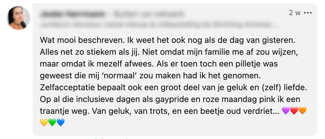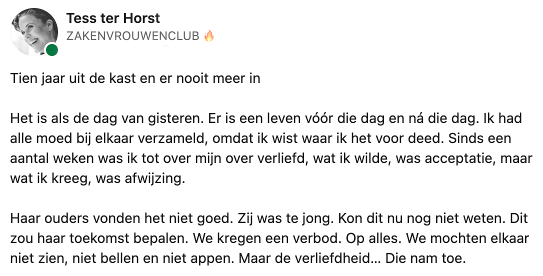 Uit de kast komen is niet makkelijk en iedereen doet dat op diens eigen manier. Tess werd tien jaar geleden verliefd op een vrouw die ook gek was op haar. Ze ondernamen van alles samen, maar de familie van haar geliefde accepteerde de twee niet. Het was een lastig gevecht en nu, tien jaar later, deelt Tess haar verhaal.