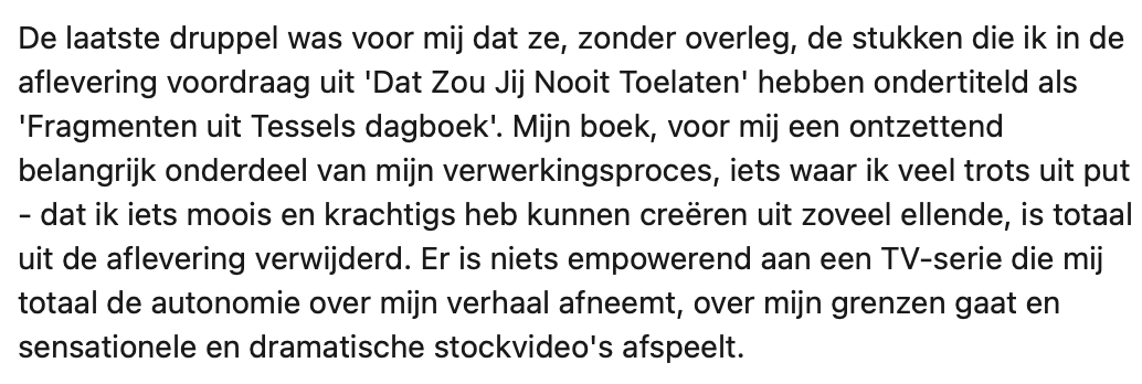 3. Ze heeft het idee dat de programmamakers haar grenzen niet respecteerden en dat er geen veilige omgeving was. Zeker als je met deze doelgroep werkt is dat volgens haar erg belangrijk.