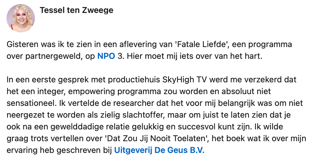 Tessel ten Zweege was deze week te zien in het televisieprogramma ‘Fatale Liefde‘. Op LinkedIn deelt ze haar ervaring over deze deelnamen. De eerste gesprekken met de productie verliepen prima en ook de opnamen zelf gingen goed. Ze vertelt dat de redactie daarna alleen vrij opdringerig werd en zich opdrong aan zowel Tessel als haar familie. Ook vindt ze dat bepaalde dingen foutief zijn weergegeven en dat niet alle afspraken zijn nagekomen. Tessel vertelt dat ze dit LinkedIn-bericht in eerste instantie schreef om stoom af te blazen, maar dat al snel bleek dat meerdere mensen met hetzelfde probleem rondliepen.