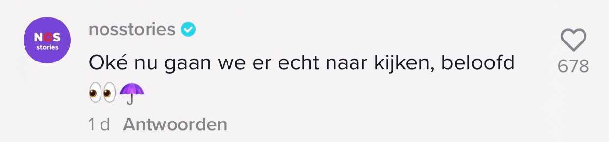 Thirza won in 2017 via het Instagramaccount NOS Stories een NOS-paraplu. De NOS beloofde de paraplu op te sturen, maar heeft dit nooit gedaan. Inmiddels heeft Thirza de NOS in 2018, 2020 en nu 2021 wéér benaderd en deelt het verhaal op TikTok en haar video’s worden door veel meer mensen opgepikt dan ze had verwacht. Ze deelt de updates met ons.