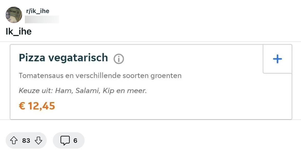 Je hebt mensen die werkelijk alles eten wat los en vast zit en je hebt mensen die dat niet doen. Bijvoorbeeld omdat ze een allergie hebben, gewoonweg niet zoveel lusten of omdat ze vegetariër zijn. Gelukkig vind je tegenwoordig bij de meeste restaurants meer dan genoeg opties en kan je veel gerechten helemaal naar jouw smaak aanpassen. Sommige horecatenten trekken dit concept echter wel érg ver door. Wanneer een Reddit-gebruiker via Thuisbezorgd door de menukaart van een restaurant scrolt, ziet diegene namelijk nogal onlogische toppings als opties bij een vegetarische pizza staan.