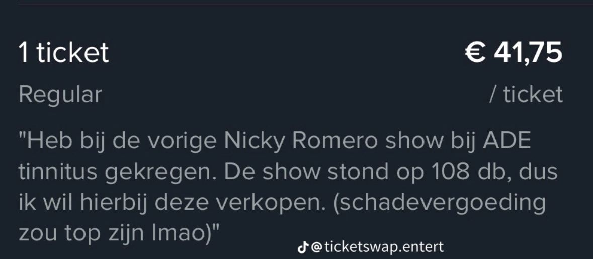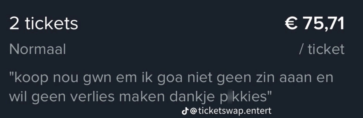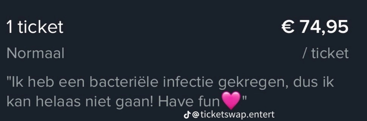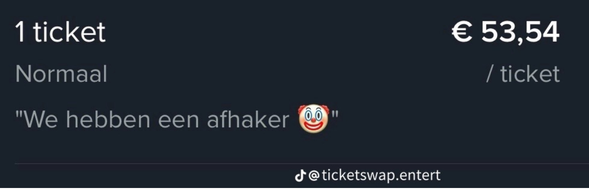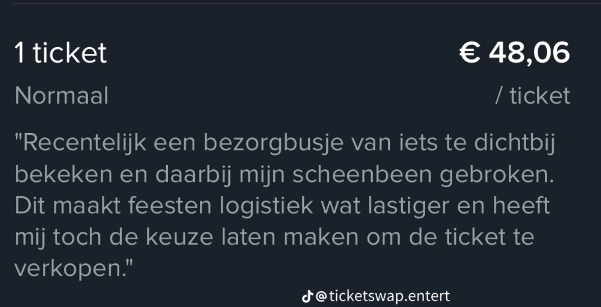 Het zo nu en dan bezoeken van een festival of concert is leuk en aardig. Maar het feit dat je die tickets zó ontiegelijk lang van tevoren moet aanschaffen, kan nog weleens wat problemen met zich meebrengen. Terwijl Harry ineens naar een belangrijke balletvoorstelling van zijn dochter moet, heeft Nils tijdens zijn kelderklasse-debuut z’n enkel op drie plekken gebroken. Tja, dan is TicketSwap natuurlijk dé uitkomst. De redenen waarom mensen hun tickets via dit platform verkopen, kunnen je nog weleens helemaal van de kaart brengen. Op TikTok speelt het account Ticketswap.entert open kaart en worden een aantal van deze bizarre (maar goudeerlijke) redenen gedeeld.