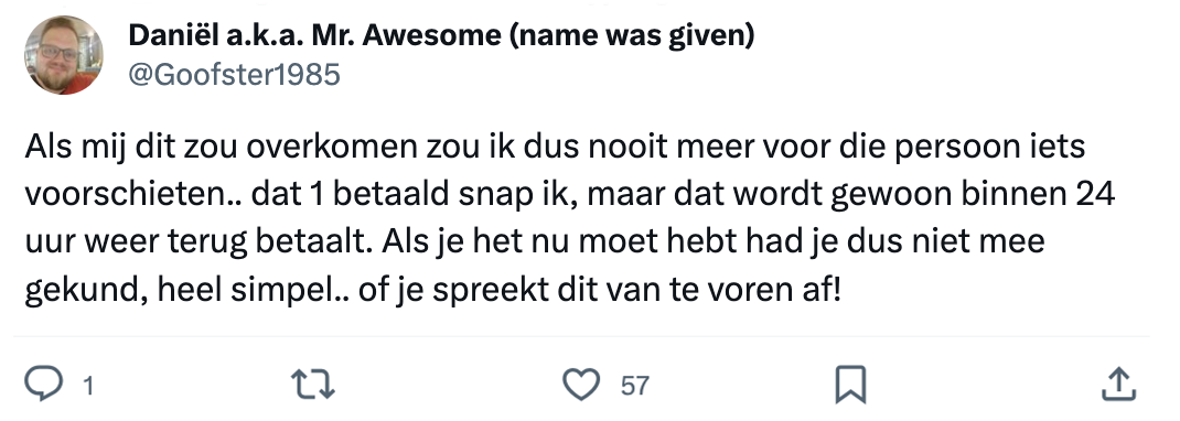 1. Er is volgens deze twitteraar dus één belangrijke Tikkie-regel waar Nederlanders zich aan horen te houden: schiet iemand voor, dan betaal je direct. Zonder ook maar enige uitzondering.