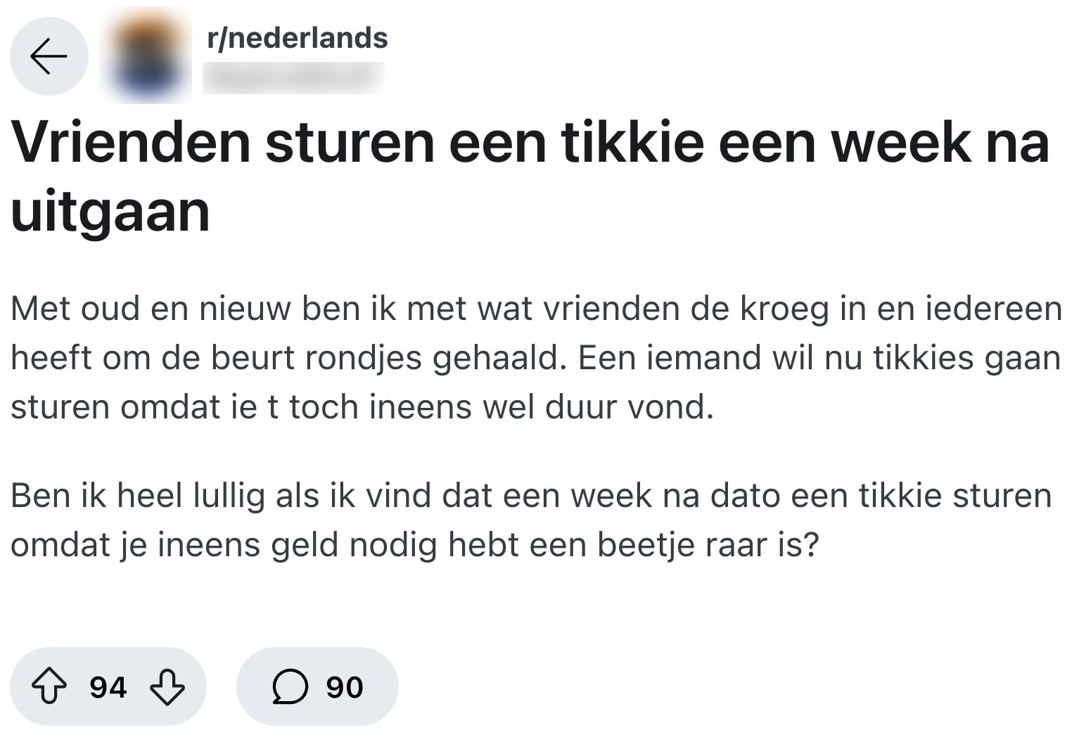 Tijdens de feestdagen is er een hoop gegeten en gedronken, en dat kost natuurlijk allemaal geld. Misschien had je stille hoop dat de jackpot op jouw lot zou vallen, maar de meeste mensen zullen toch echt zelf moeten lappen voor alle versnaperingen. Deze Nederlander krijgt na oud en nieuw dan ook een bijzondere Tikkie, maar iets daaraan voelt niet helemaal goed. Daarom vraagt diegene online om advies.