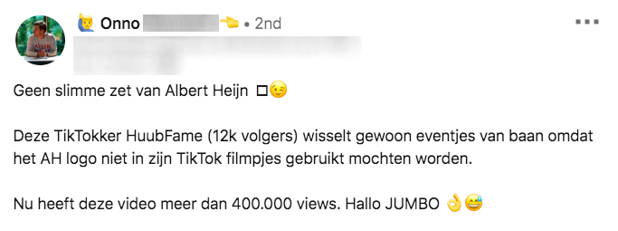 Een vriend van hem heeft bij de Jumbo gewerkt en had dus die kleding nog liggen. Zo werd het idee voor de video geboren. Hij is dus niet echt overgestapt naar Jumbo zoals hierboven wordt gesuggereerd. AH-TikTok’s zitten er voorlopig niet in. Maar Huub is wel door meerdere bedrijven benaderd om voor hen te komen werken. Of Huub op het aanbod in gaat weet hij nu nog niet…