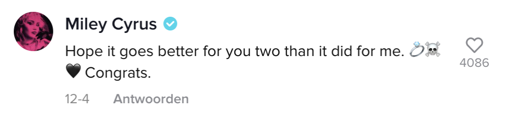 Je zou denken dat beroemdheden met miljoenen volgers over de hele wereld niet alle berichten lezen die ze krijgen op social media. Toch verrast Miley Cyrus veel fans door te reageren op een populaire TikTok trend. Mensen plaatsen video’s waarin ze zeggen dingen te zullen doen als Miley Cyrus reageert. En ze stelt niet teleur.