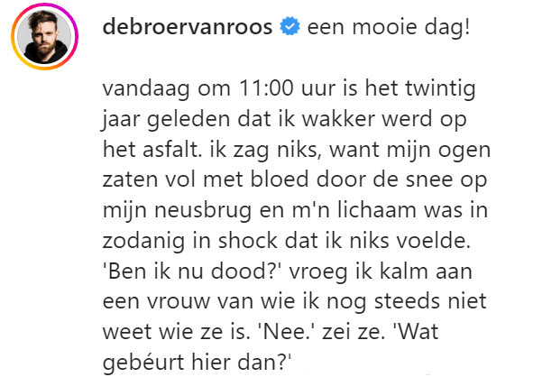 Tim Hofman deelt op zijn Instagram een aangrijpend verhaal over een ongeluk dat hij twintig jaar geleden meemaakte. In dit bericht weet hij onder woorden te brengen wat dit ongeluk hem allemaal voor ‘goeds’ heeft gebracht. Zijn volgers zijn erg onder de indruk van zijn verhaal, wat zorgt voor veel lovende reacties.