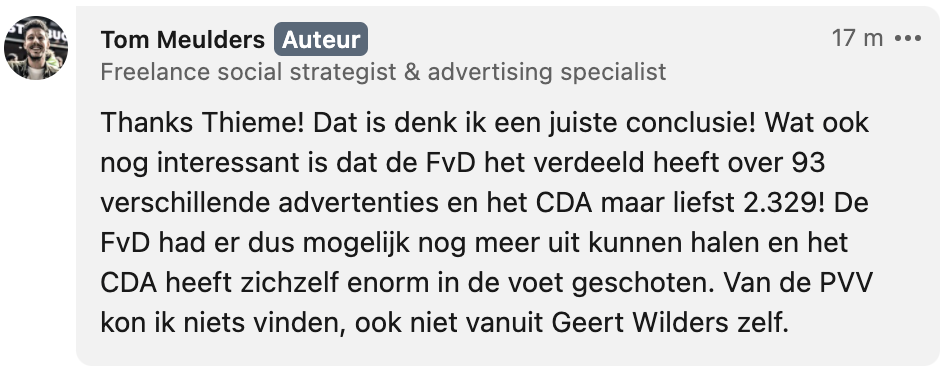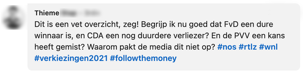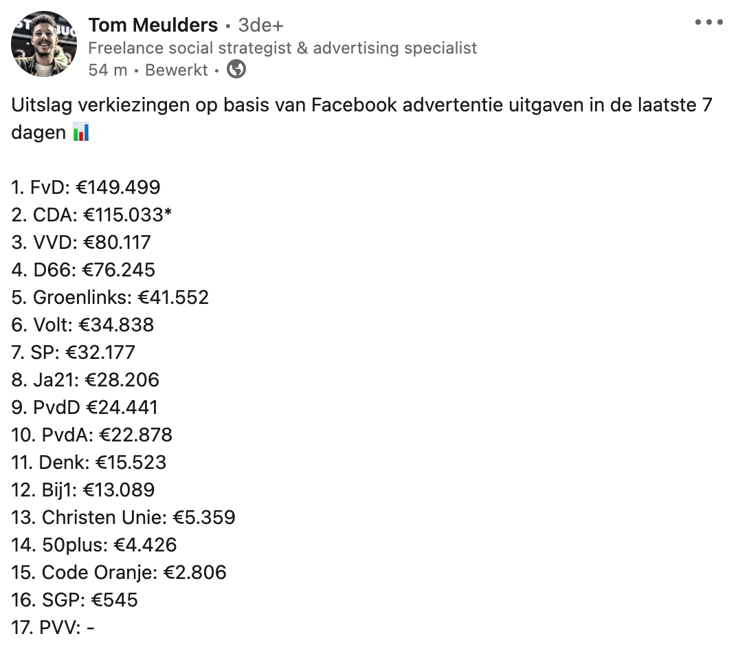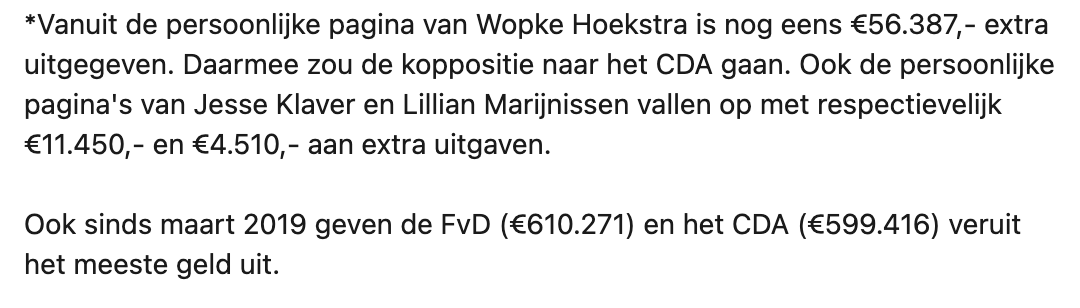 1. Dit is de post van Tom. Zoals je kan zien heeft Forum voor Democratie ver uit het meeste geld uitgegeven in een week tijd.