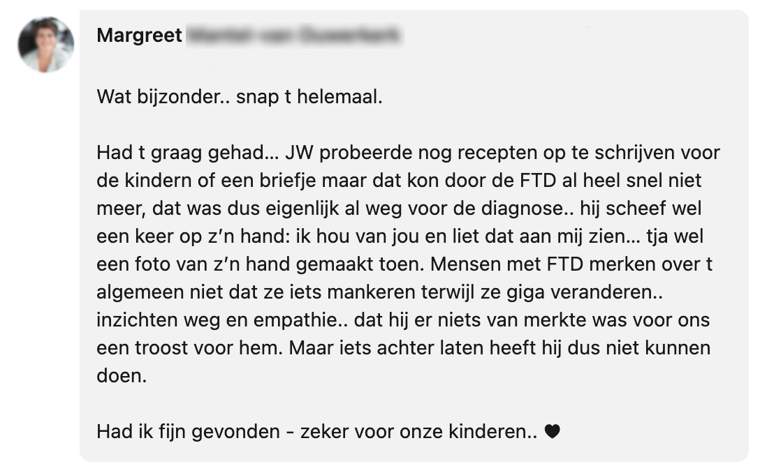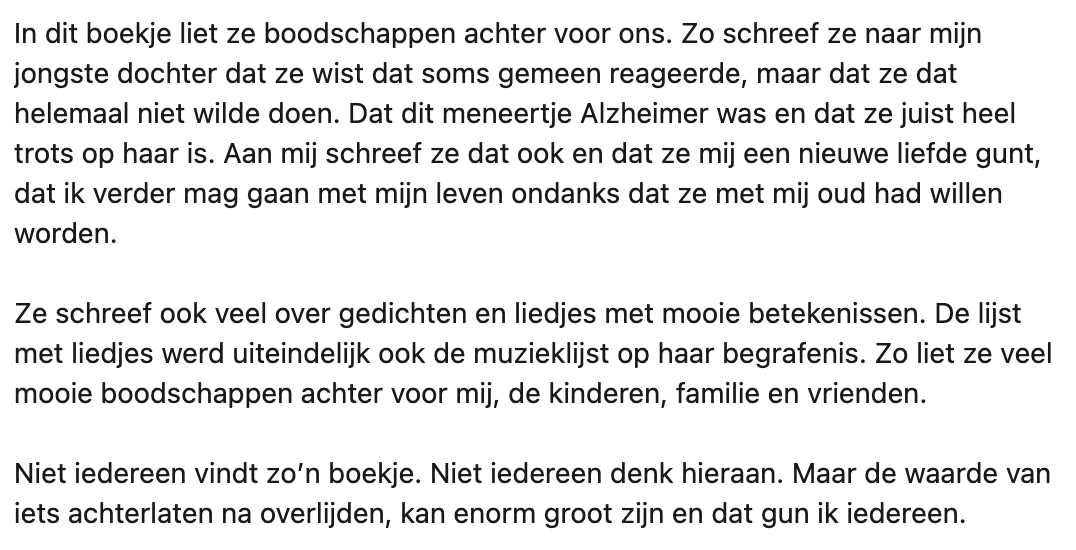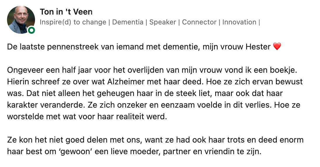 De vrouw van Ton had Alzheimer en vond het moeilijk haar gevoel hierover te uiten. Ze wilde niets liever dan een ‘gewone’ moeder, partner en vriendin zijn. Daarom besloot ze haar gedachten en bepaalde boodschappen voor haar man en kinderen op te schrijven in een boekje. Op LinkedIn deelt Ton de mooie woorden van zijn vrouw en dit maakt enorm veel los bij anderen.